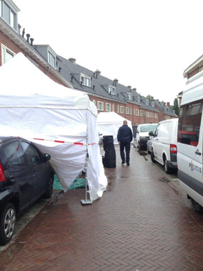 | De Technische Recherche is meer dan een dag bezig geweest met het onderzoek rond de dood van de 39-jarige Selim van der Heijden bewoner van de Wilgenstraat. foto © politie den bosch, 29 juni 2016 . | ![]() |