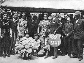 V.l.n.r.: zus van moeder van Vught, knecht, moeder Van Vught, opa Adriaan van Vught, zus van moeder Van Vught, tussen jhaar en burgemeeseter Frans van Lancchot net zichtbaar de echtgenote van Jos van Vught, dan twee tantes van Kees Stolzenbach, Heintje van der Horst, en nog een onbekende met hoed.. Kees Stolzenbach. de in 1986 overleden echtgenoot van Annie. zit op de grond links naast het bord 1891-1941. |