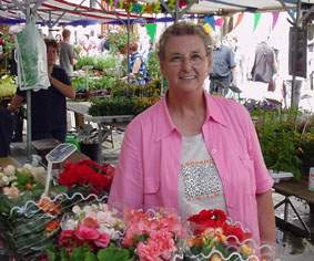 Zaterdag 12 augustus 2000 stond An Stolzenbach vijftig jaar op de Bossche Markt. Het was de dag waarop zij officieel afscheid nam van haar klanten die al die jaren haar bloemen-, en plantenkraam bezochten. -Temidden van de eigen en de vele geschonken bloemen troonde An een dagje achter haar kraam, soms glunderend en soms met een traantje in haar ogen. Op de rechter foto op de achtergrond Annies dochter. foto © paul kriele, 12 augustus 2000. |