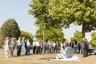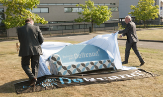 -Links De onthulling van de Social Sofa door wethouder Jan Hoskam en scheidend voorzitter van het bestuur van De Brand Rob Gielens. -Boven: Groepsfoto van betrokkenen en vertegenwoordigers van Bossche bedrijventerrein. |