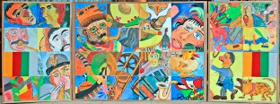 Het tafereel groot ..x .. lijkt op een Jeroen Boschwerk met dezelfde speelse figuren maar dan in een eigentijdse compositie, zoals daar zijn een Oetel in een karretje, een Tubaspeler, een zandloper en allerlei dieren en gedrochten in kleurrijk geklede en vrolijke stemming, zoals de Oetels zijn.. Geel voor het bier, rood voor de liefde, groen voor het moeras en het gras en grijs voor Aswoensdag.