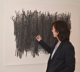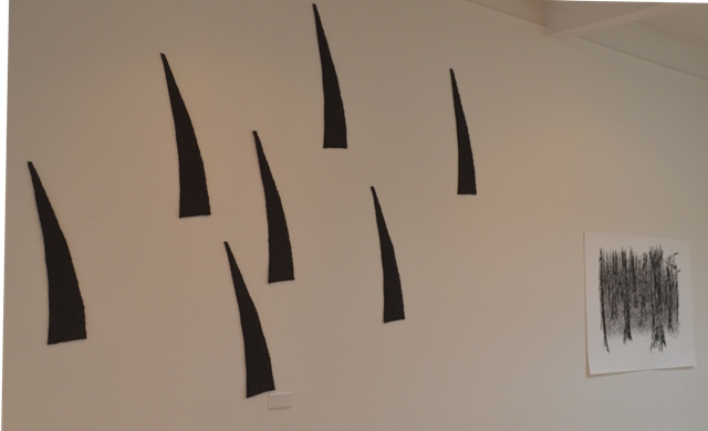 Hieronder: Twee [eentje hierboven rechts] overeenkomstige werken die resp. ‘a walk in the black forest’ 1 en 2 heten, met galeriehoudster Mieke van Schaik erbij afgebeeld.