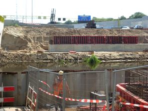 Op knooppunt Hintham kunnen fietsers onderlangs [langs de Aa] en onder de wegviaducten door van de Heijmanswijk naar Hintham Berlicum en bedrijfspark de Brand fietsen. Hier zijn ondanks de bouwvak nog ijzervlechters bezig voor de beton bewapening. |