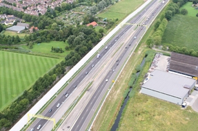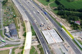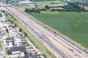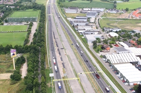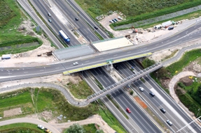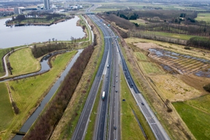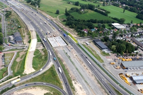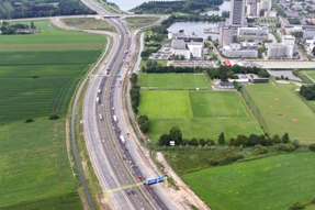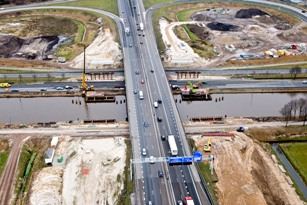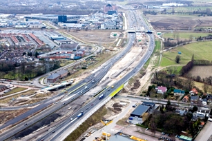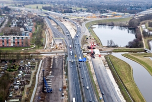 | Boven en rechts: Komend vanuit Vught richting Utrecht komt De Pettelaar met een nieuw viaduct in de Gestelseweg [rechts] als eerste in beeld. foto's © InfraA2 en RWS, 24 februari 2009 en maart 2009. |