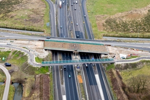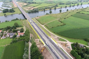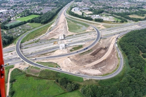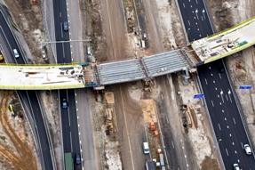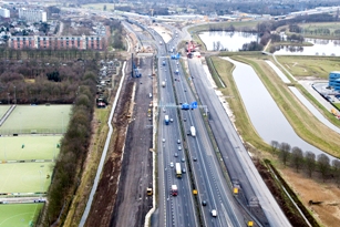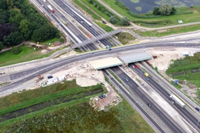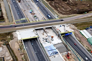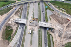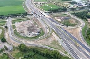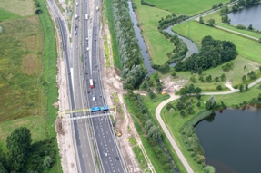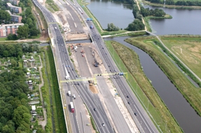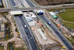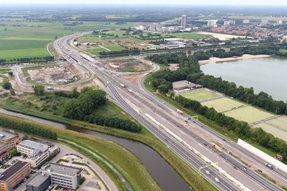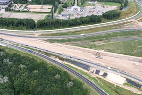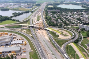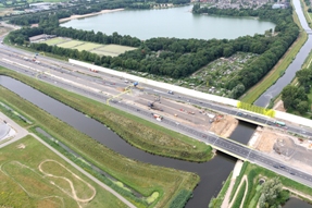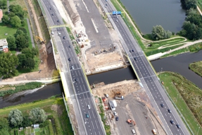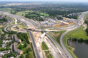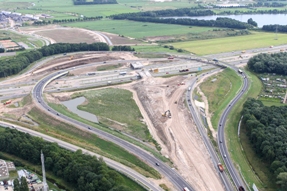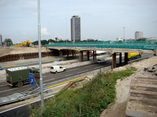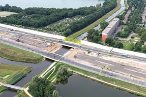 | Kruising rondweg met Gestelseweg en de aanleg van een tweede viaduct aan de oostelijke kant. Ook is vooraan de tijdelijke fietsbrug te zien. | Zelfde situatie als linker foto. foto's © rws joop van houdt, juli 2009. |