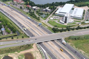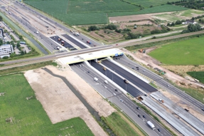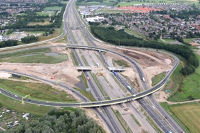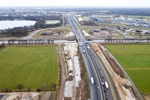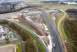 -Rechts onder: een opname vanuit het Noorden gezien met rechts de nieuwe flyover voor verkeer Utrecht-Nijmegen en middenin de flyover voor verkeer Nijmegen-Eindhoven.