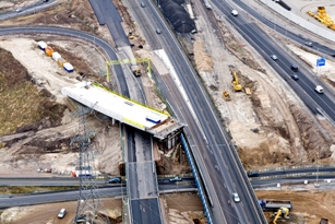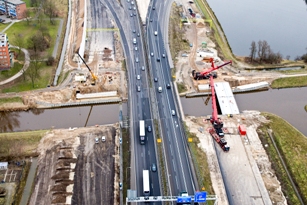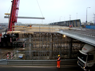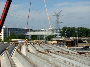 | Rechts: Hijsen liggers voor fly-over van verkeer Utrecht-Nijmegen. Op de achtergrond de flats aan de Jan Heijmanslaan in Hinhtam. foto's © InfraA2 en RWS, 24 februari 2009 en maart 2009 |