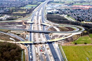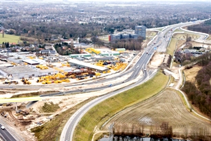 | Boven het knooppunt Empel met links achterin sportpark de Saren en rechts nieuw Empel en het bedrijfspark . | Detail van de fly-over knooppunt Empel. foto's © InfraA2 en RWS, 24 februari 2009 en maart 2009. |