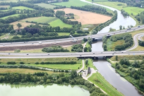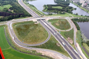 | De rondweg [ dwars over de foto] ter hoogte van knooppunt Empel. De fotograaf in de heli kiekt vanuit het Oosten naar het Westen richting Maasroute die achterin de foto 'wegloopt'. | De aan-en afvoerwegen van knooppunt Empel. foto's © rws, joop van houdt, juli 2009. |