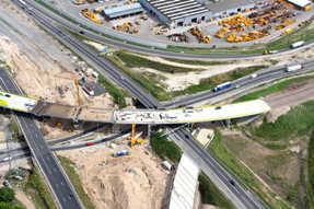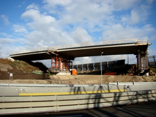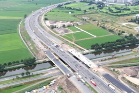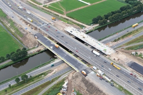 | Hierboven: Overzicht van de onderdoorgang van de A2 onder spoorlijn naar Nijmegen met de verbrede viaducten. Links: een spoorwegviaduct ligt klaar om ingeschoven te worden. foto's © InfraA2 en RWS, 24 februari 2009 en maart 2009 |