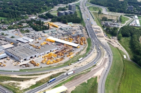 | Luchtfoto van de kruising met de Graafsebaan, die schuin van links-midden naar rechts-onder het midden, loopt. Links bovenin: Het redelijk nieuwe bedrijfspark in Hintham Noord: de Grote Elst. | Hijsen van de leggers voor het viaduct in de Graafsebaan-Oostzijde. foto's © InfraA2 en RWS, 24 februari 2009 en maart 2009 |