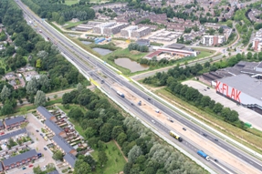 | De rondweg kruist de Graafsebaan waar twee nieuwe viaducten bijkomen. Links boven het midden: de nieuwe kantoren aan de Grote Elst. Onderin een stukje Heijmanswerf en rechts bovenin deJumbo, waarachter in het weiland een nieuwe ontsluitingsweg komt te liggen.Graafsebaan met de nieuw viaducten. Foto rechts: De kantoren aan de Grote Elst van nabij gezien. foto's © rws joop van houdt, juli 2009. |