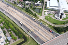 Boven links en rechts : de Rondweg nadert -na het kanaal- het Pettelaarpark richting Vught: rechts bovenin de hoek de sportterreinen op de Meerendonk en al een deel van het Pettelaarpark waar het Provinciehuis [linker foto] boven uitsteekt. -Onder links: het Pettelaarpark, achterin de kruising met de Gestelseweg waar tijdelijk een fietsbrug is aangelegd naast het oude viaduct. Daar wordt ook een nieuw viaduct naast gelegd. Achterin de foto rondweg richting Vught. foto's © rws joop van houdt, juli 2009. |