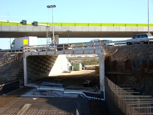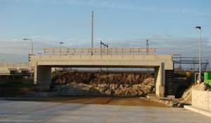 | Hierboven de fly-over voor verkeer van Utrecht naar Nijmegen. Op linkerfoto de onderdoorgang voor het verkeer vanaf Nijmegen naar Eindhoven. | foto's © InfraA2 en RWS, 24 februari 2009 en maart 2009 |