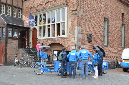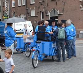 | Markt bij VVV-kantoor. Met materiaal opgeborgen in de bak van de driewieler, waarop een parasol staat, gaan de Blauwe Engelen bijna dagelijks naar hun vaste stek in de binnenstad ter begroeting van toeristen en andere passanten. foto © paul kriele, 14 juli 2017. .............................................................. |