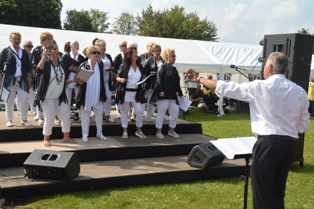 Links boven: Diana Hendriiks-Brok als dirigent van de vier koren. -Boven- Medeorganisator Tonnie Alders-Netten. -Links hieronder: Dirigent Kees van Gulik en geheel onderaan Het optreden van de Deuterse Mix bij café De Sjeng. foto's © paul kriele, 3 september 2017. |