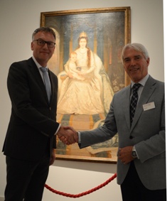 De ceremoniele overdracht van het schilderij met de OLVrouw van P.M. Slager uit 1897. links burgemeeter Hans Janssen van Oisterwijk en rechts de voorzitter van de stichting Museum Slager Peter Berlijn. |
