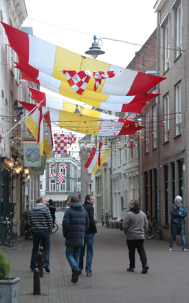 Rechts: Voorheen hing in de Snellestraat [foto © paul kriele, 19 februari 2014] hing daar een paar jaar achterheen deze grote vlaggen. Maar ze moesten op verzoek van de brandweer om veiligheidsredenen ! worden verwijderd.