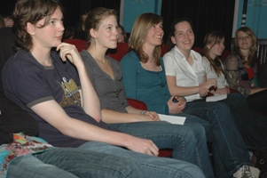 | Foto rechts boven: Tosca Schreuder die met het voordragen van haar gedicht 'Weggeweest' ook een 2e plaats behaalde. Foto links boven: De winnares Carmen Wijnen, die zowel qua inhoud als qua voordracht de 1e prijs behaalde. Jurylid Ruben van Gogh :'Je wordt soms meegenomen door een gedicht. 'Parels' was voor ons het rijkste gedicht dat er bij zat.' Foto rechts: Rosalie Fleuren, tweede prijs voordracht. foto's © paul kriele, 17 april 2009. |
