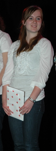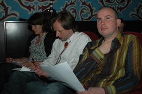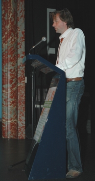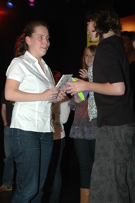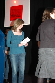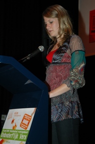 | Annemiek van Kessel die door haar voordracht de tweede prijs voor de beste inhoud. | Ruben van Gogh, dichter en voor deze gelegenheid jurylid. foto's © paul kriele, 17 april 2009 |