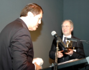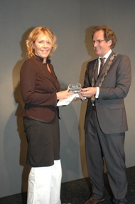 | Burgemeester Rombouts reikt 'de Vuurslagprijs' uit aan de directeur van het Filmmuseum Sandra den Hamer vanwege het behoud van het cultuur-historisch erfgoed. | Burgemeester Rombouts en de Amsterdamse afvaardiging van het Filmmuseum: Sandra den Hamer, Geke Roelink, Emjay Rechsteiner, Verder nog: Mrjan Diehl, Walter Swagemakers, Anne Floor van Tilburg en Inge Scheijde en Jan van den Brink. foto's © paul 18 april 2009. |