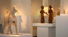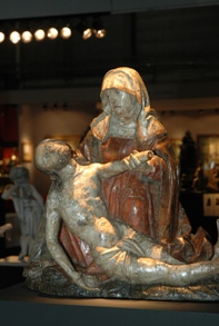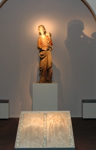 | Rechts: Staande Madonna [1260-1280] Galerie De Baekker Medieval Art. Hoofstraten België |