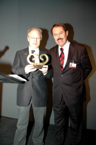 -Hierboven: Voorzitter van de Art Fair 's-Hertogenbosch Jan Roelofs die prof. Jos Koldeweij dankt om zijn 15-jarig voorzitterschap van de Stichting Vuurslag. Aan Koldeweij werd een 18e eeuwse Vuurlsag uitgereikt.