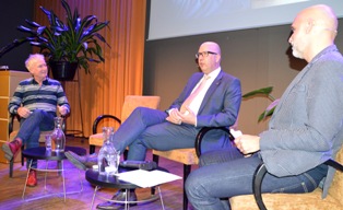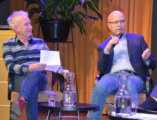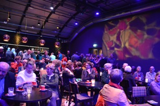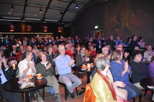 | -Links: Een indruk van de belangstelling voor de nieuwe editie van Nieuwscafé in de Verkadefabriek van dinsdag 28 november 2017. -Boven: Burgemeester Jack Mikkers onderging ruim een maand na zijn start als burgemeester van Den Bosch een inburgeringsavond. Links NOS-Verslaggever Theo Verbruggen en rechts de Brabants Dagbladredacteur Theo van der Zande. foto's' © paul kriele, 28 november 2017. |