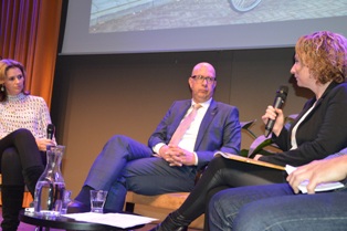 | -Boven: socioloog in volkscultuur Gerard Rooijakkers -Rechts boven: Burgemeester Mikkers temidden van Geertje Cousin [l] en Tessa van Berkel, die een inbreng hadden namens het in Tilburg ontstane magazine Quiet. Dat is bedoeld als de tegenhanger van het glamour-magazine voor de rijken Quote. -Rechts professor aan AVANS verbonden, Emile Kolthoff, specialist in de destabilisering van de criminaliteit, ofwel ondermijning. foto 's © paul kriele, 28 november 2017. |