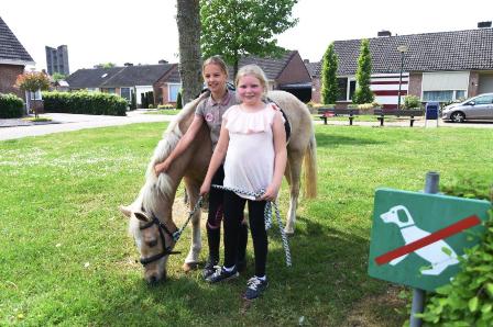 Evie en Jillie: even met hun paardje een ommetje maken door het dorp. foto © henk van esch,11 mei 2018. .................................................... |