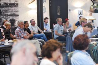 | -Boven: Dagvoorzitter Hans Bouwers - Rechts en rechts boven: docent Jacob Stuijver. -Onder: Indruk van de zaal met 35 Vinkelnaren. |