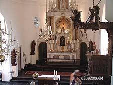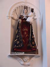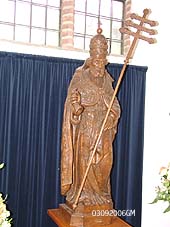 | Boven: het beeld in het kerkje van Bokhoven van de H.Cornelius. Rechts: Het kerkinterieur van Bokhoven met Mariabeeld [r.] en orgel [m]. foto's © gerard monté, 3 september 2006. |