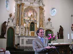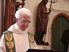 | De eerste zondag van september [11.00 uur], waarop de traditie van de bedevaart naar Bokhoven begint. Pastoor X. van der Spank, die de eucharistievierng leidt in een overvolle kerk [r], waar Van der Spank na afloop nog even met de kerkgangers praat. | foto's © gerard monté, 3 september 2006. |