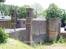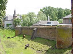 Het kasteel en omgeving: restanten van het kasteel en de muur er langs met voormalige kasteelgracht en kapelletje.De poort die toegang geeft tot het kasteel en momenteel [sept. 2004] in restauratie is. foto's © gerard monté, 20 juni 2004. |
