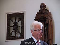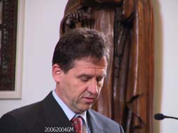 | Twee goed van de tongriem gesneden sprekers bij de presentatie van het boekje 'Bijzonder Bokhoven'. Links pastoor Xavier van der Spank die een aandeel had in de eindredactie en rechts burgemeester Rombouts. | De burgemeester erkende bij de ontvangst van het 'eerste exemplaar', dat ie te weinig voor Bokhoven doet. foto's © gerard monté, 20 juni 2004. |