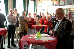 | Boven: Rob van de Laar, voormalig president van de Oeteldonksche Club in gesprek met Paul Bleijs in het vergaderlokaal van de OC in Zusters van de Orthenpoort.. | Boven: Toespraak door Herman van den Heuvel voor de Vrienden van het Muzejum, sponsoren en suppoosten en bestuur. |