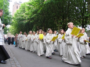 Onder: de processie passeert het bisschoppelijk paleis en rechts: de Schola Puellarum.