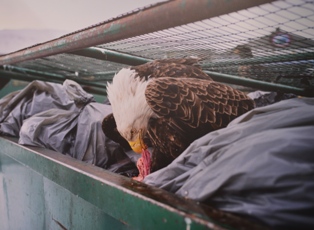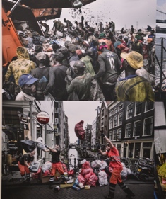 | -Hierboven: Leerlingen van het Van Maerlant GT4 [Gemengd Theoretisch] bij de foto van een vluchtend brandende man in de Venezuelaanse crisis. foto © ronaldo schemidt. Milieuaspecten -Rechts boven: Vuilnis ophaaldienst in Amsterdam en daarboven Amerikaanse mannen die spullen zoeken van een lossende vuilniswagen. -Rechts: Een op het eiland Unalaska [Alaska] teruggekeerde Zeerarend, die vleselijk afval pikt uit een vuilcontainer. foto's © kadir van lohuizen, Noor Images |