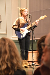 | Eva van Pelt zorgde met haar omfloerste stem en begeleid door haar gitaar voor wat subtiele gezongen liedjes. foto © paul kriele, 21 november 2018. ..................................................................................................................................... |
