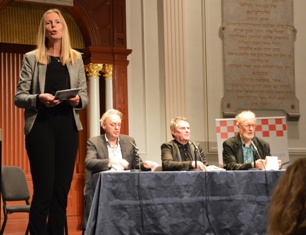 | De forumdiscussie olv Jantine Schuit met vlnr stadschroniqueur Eric Alink, oud-Volkskrant redacteur Jan Tromp en voormalig provinciaal redacteur Ron Lodwijks. foto © paul kriel, 21 november 2018. .................................................................................................. |