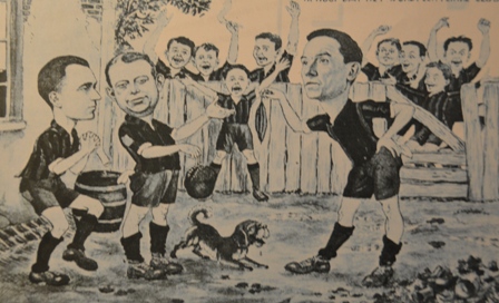 | Cartoon uit 1906, het oprichtingsjaar van BVV met als eerste leden/spelers: vlnr.: Jan Hootsmans, Gijs van Leur en Jos Kappé. ................................................................. |