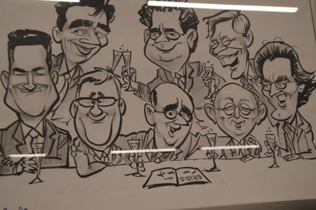 Op deze cartoon van de toenmalige bestuursleden van de GRIDS, zoals JADS nog als werktitel had, vooraan, uiterst links Koen Becking en uiterst rechtsTon Rombouts. Op de achterste rij links Eric Logister, toenmalig wethouder van Onderwijs en middenin gedeputeerdre Bert Pauli en rehtsFrank Baaijens rector maginficus UvE. Naast Rombouts Jan Mengelers voorzitter College van Bestuur Universiteit Eindhoven. ....................................................................................... |