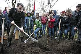 50 kinderen van Educatief Centrum 't Sparrenbosch plantten woensdag 13 maart 2019 met wethouder Mike van der Geld eetbare bomen op de Paardenweitjes in Rosmalen. |