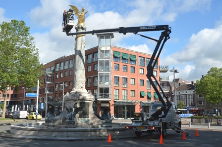 De gemeente antwoordt op vragen: In verband met de restauratie van de Drakenfontein voeren we de komende maanden af en toe voorbereidende onderzoeken uit en maken we een 3D scan van de draak. Naar verwachting starten we eind van het jaar met de restauratie van de draak.