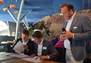 | Boven: De ondertekning van het kontrakt als hoofdsponsors van Bourgondisch Sligro en Swinkels Family Brewers door Koen Slippens [links] en Peer Swinkels [middenin.] Rechts de voorzitter van Bourgondisch Edar Dissel. foto's © paul kriele, 17 juni 2019. |