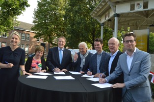 Provinciaal gedeputeerde Marianne van der Sloot, Yvonne Moerman [Kring Vrienden van Den Bosch], de vier wethouders en Gerard Brekelmans van de Stichting De Groene Vesting tekenen het convenant over de verdere ontwikkeling van de Linie 1629. foto © paul kriele, 9 september 2019. ..................................................................... |