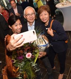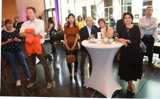 -Boven: De familie Tsang met de voorzitter van Bourgondisch 's-Hertogenbosch Edgar Distel. -Links: Zaal van het Bestuurscentrum met middenin prof. Van der Geld en Joke van den Boer van Maison van den Boer. foto's © henk van esch, 9 september 2019. |