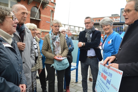 Huldiging van het Haagse echtpaar Marius Schoon en Cornelia Peters door de voorzitter van de stichting Gastvrij 's-Hertogenbosch Ans Buijs. Rechts 'Aartsengel' Ton Rombouts en 3e van rechts Wim van der Steen van Hotel Mövenpick die met cadeaus kwam aandragen. Onderaan: Voorzitter Ans Buijs huldigt met bloemen ook de chauffeur Bert Frencken. foto's © paul kriele, 12 oktober 2019. |