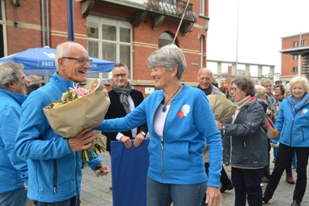 Met een boeket bloemen, aangeboden door voorzitter van Gastvrij ‘-s-Hertogenbosch, Ans Buijs, trok het gezelschap na de ceremonie naar CoffeeLab op de hoek Stationsweg –Koninginnelaan, waar zij met een feestelijk kop koffie onthaald werden.