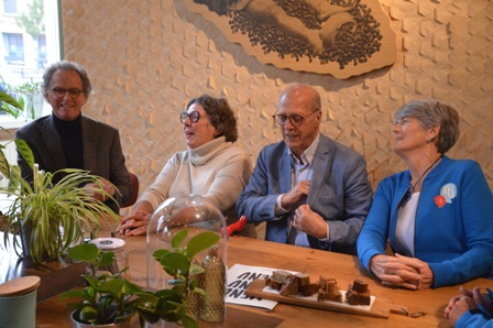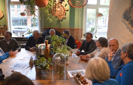 Feestelijke afsluiting in CoffeeLab op de hoek Stationsweg -Koninginnelaan. Rechts naast Ton Rombouts het Haagse echtpaar Marius Schoon en Cornelia Peters en uiterst rechts de voorzitter van de stichting Gastvrij 's-Hertogenbosch Ans Buijs. Foto hieronder: Achter de tafel zitten vlnr. Ben van Herpen en Joop Thissen, die voor de start van de gratis busjes met Pasen 2017 een haalbaarheidonderzoek hadden verricht. Dan oud wethouder Paul Kagie en ook achter de plant Wim vand der Steen van hotel Mövenpick. foto's © paul kriele, 12 oktober 2019. |